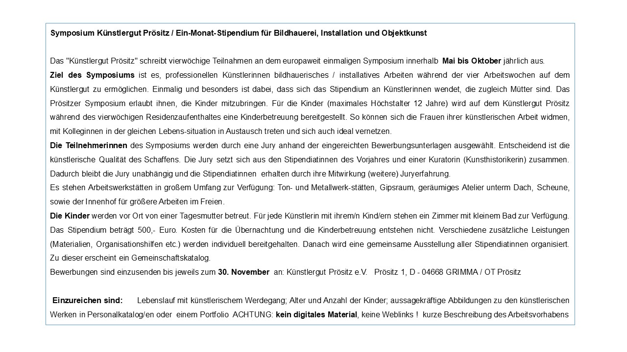Ansatzpunkt ist die noch immer vorhandene gesellschaftliche Benachteiligung von Frauen, wenn sie die Elternzeit mit beruflicher Weiterentwicklung koppeln wollen. Da für Künstlerinnen mit Kleinkindern herkömmliche Förderungsformen, z.B. Plenair und Studienreisen, ungeeignet und sie dadurch vom Kunstmarkt isoliert sind, will der Verein diese Lücke in der Ausbildung von Künstlerinnen schließen. Ein Aufenthalt und eine Teilnahme am Bildhauersymposium im Künstlergut ermöglicht den Frauen einen intensiven Gedanken- und Erfahrungsaustausch, gegenseitige Unterstützung bei der Bewältigung technischer Aufgaben im Schaffungsprozess und die gemeinsame Gestaltung von Ausstellungen und Dokumentationen.